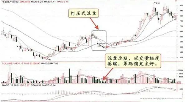 打压式洗盘是指庄家在完成建仓和大幅试拉之后,市场积累了大量的获利盘,庄家利用投资者的获利回吐欲望,猛然反手打压,使股价大幅回落,给市场制造出恐慌的气氛,动摇投资者的持股信心,迫使他们交出手中的筹码,以达到清洗浮动筹码的目的。