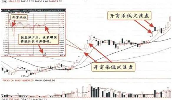 开高杀低式洗盘是指股价大幅跳空高开,甚至以涨停板开盘,然后通过对倒的方式,大手笔卖单杀出,股价大幅下跌,使缺乏信心者纷纷低价抛出手中的筹码庄家则一一通吃,直至不再有人低价卖出为止。有的庄家见到浮筹清洗基本到位,便会再次向上拉升股价,甚至急速拉到涨停封板。在日K线图上,出现“T”字线或大阴线,成交量放出巨量。采用这种方式洗盘的庄家,其实力都非常强大,操盘手法极其凶狠。