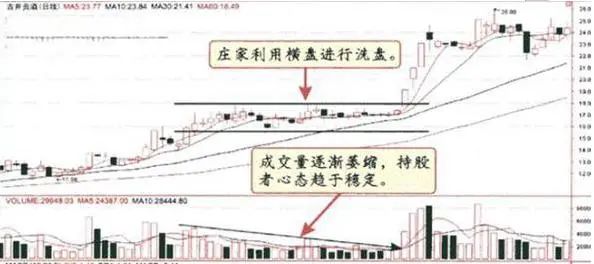 横盘式洗盘也叫平台式洗盘,其特征是股价在某一区域内形成较长时间的平台整理格局。庄家针对市场投资者缺乏耐心的弱点,用时间去消磨跟庄者的意志和耐心,迫使他们交出手中的筹码。在横盘期间,散户所持筹码在这个平台内充分换手,成交量呈逐渐萎缩状态。一般而言,采用这种方式洗盘的庄家实力较弱,主要侧重于通过长期的牛皮沉闷走势来消磨散户的持股信心,以时间换取空间,是所有洗盘方式里耗时最长的一种。这种洗盘方式较多地出现在大市上升时期和基本面较佳的绩优股中。
