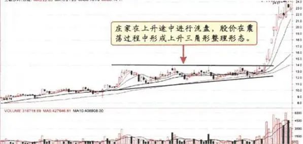 震荡式洗盘是把拉升、横盘、打压糅合贯穿到一起,是庄家最常用的洗盘手法。其优点在于:和打压式洗盘相比,可以避免低价筹码的损失;和横盘式洗盘相比,可以缩短洗盘时间。庄家通过反复上下震荡的方式洗盘,让市场投资者看不清庄家的真正意图,扰乱他们参与的步伐和节奏,使其常处于追涨杀跌之中,从而被迫离场观望。这种洗盘方法较为温和,成交量较活跃,股价维系在一个区域内上下震荡。在日K线图上阴阳结合,多以三角形、矩形、旗形、楔形等整理形态出现。